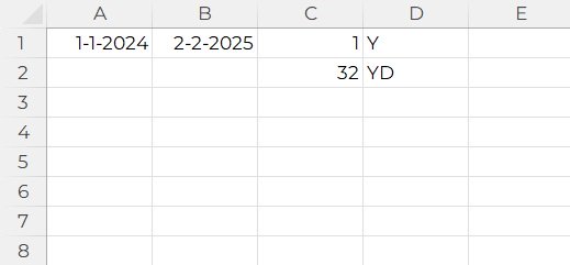 =Datumverschil(begindatum; einddatum; “D, M, Y, YM, YD, MD”)