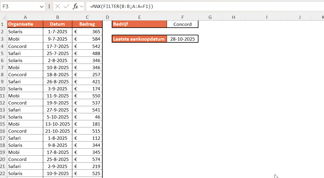 In de formule Filter geef je in eerste instantie aan welke kolom je als resultaat wilt zien (in ons geval kolom B:B). Vervolgens kun je filteren op de betreffende klant (cel F1) in kolom A. Als we nu ook nog de formule Max er voor zetten wordt de hoogste waarde uit het filter getoond, ofwel de hoogste datum in kolom B van de betreffende klant.